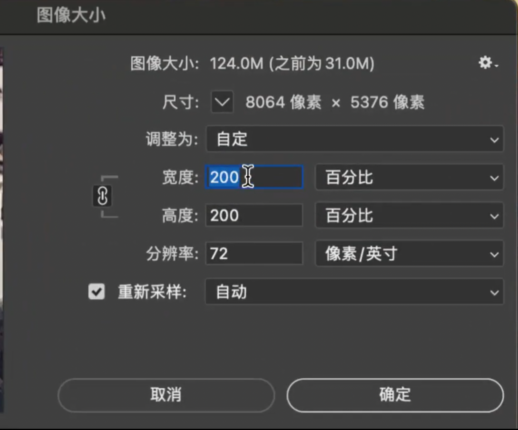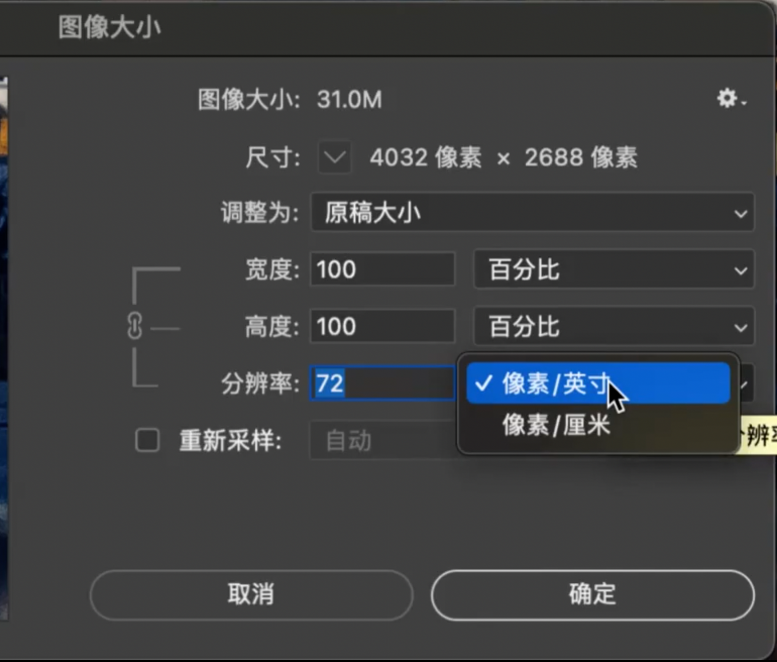 - 如果不勾选“重新采样”选项,PS会保持图片的像素不变,只是修改照片的分辨率