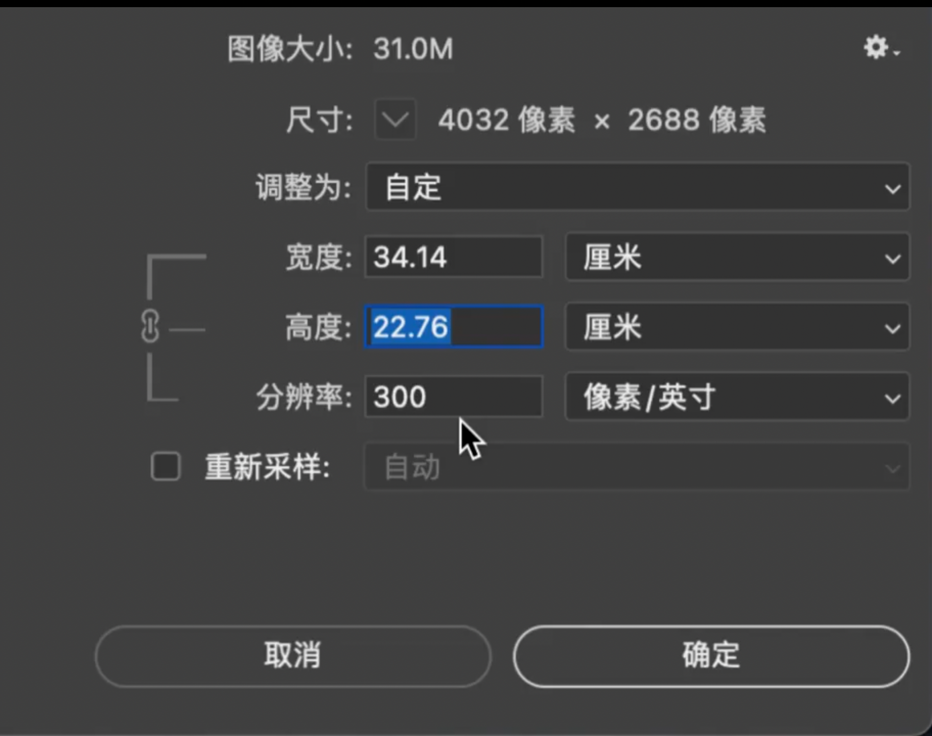 - 图片中,当打印的尺寸为34.14cm x 22.76cm时,分辨率为300PPI