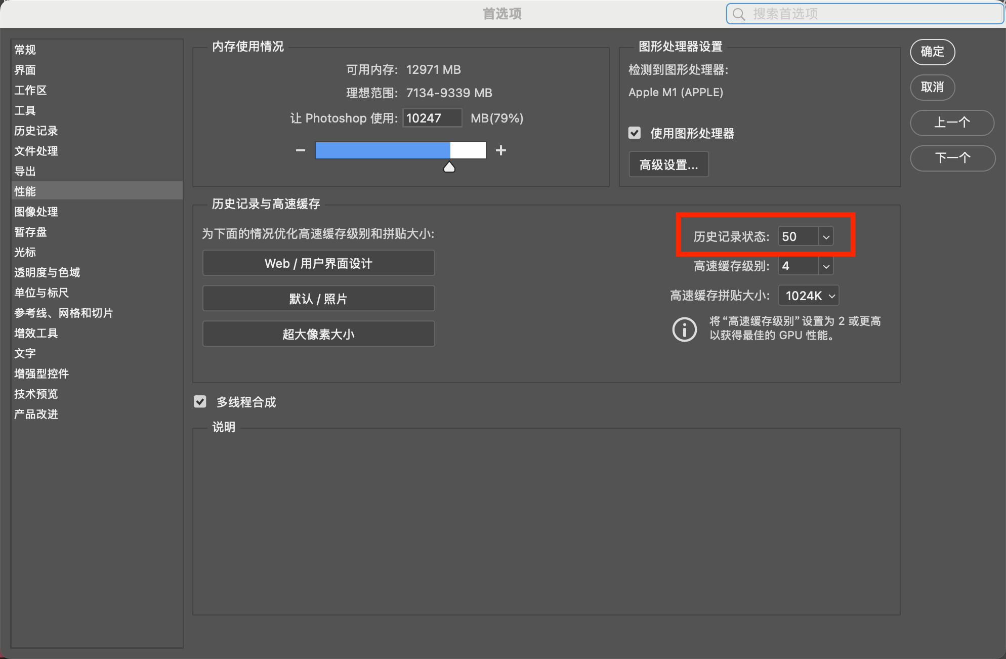 可以在顶部菜单栏的“编辑”中找到“首选项”,然后选择“性能”