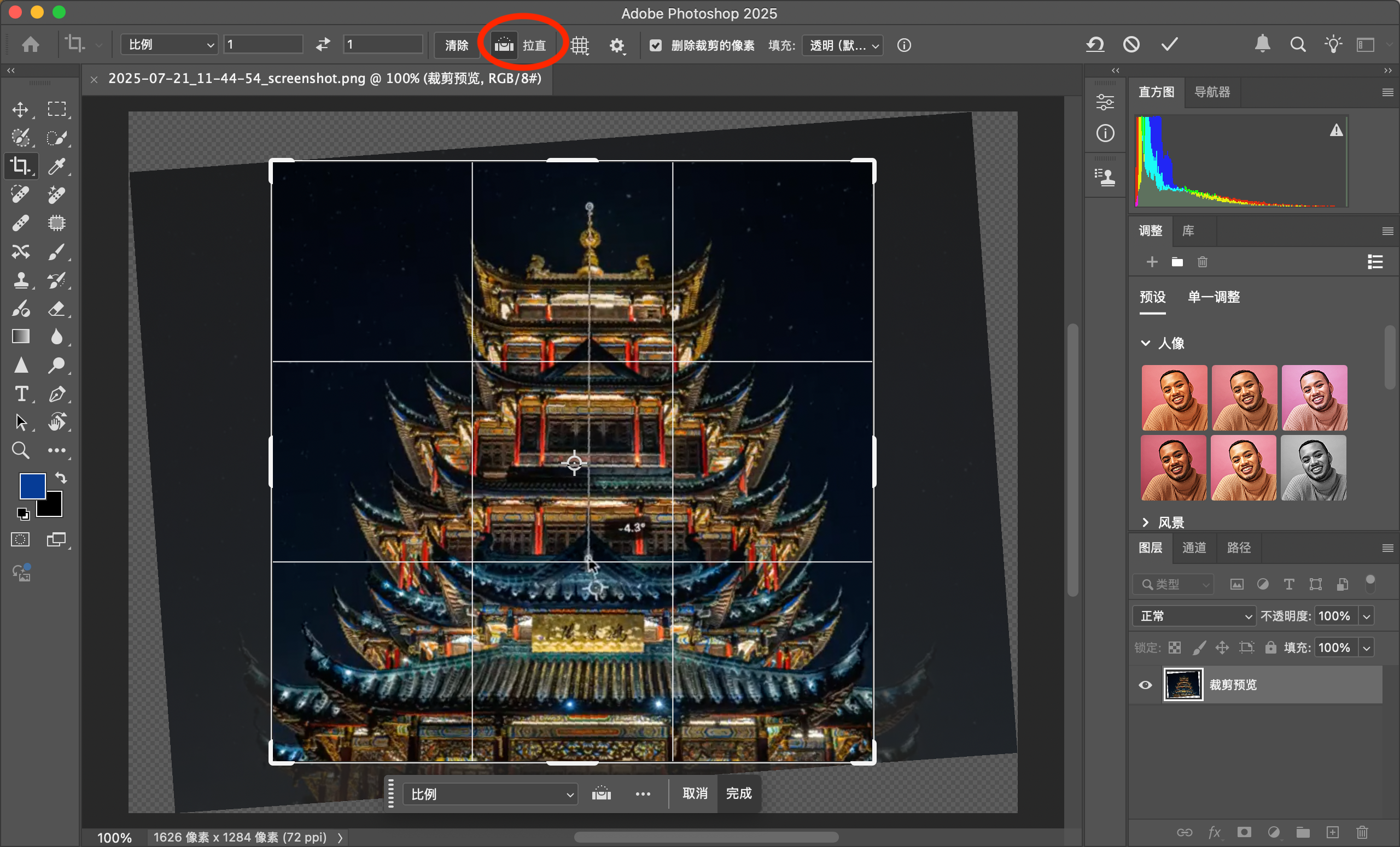 可以通过拉直工具来调整图片的水平线