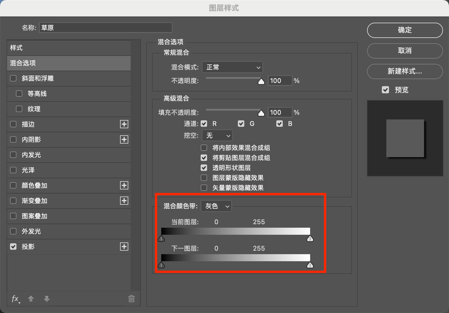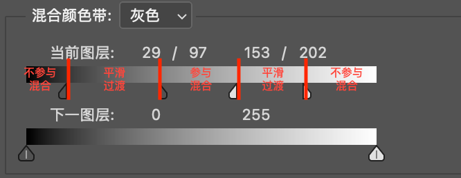 - 半透明的部分,上面的图层上对应位置也是半透明的