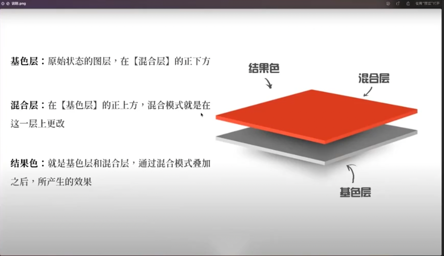 - 两个相邻的图层,下面图层的非透明部分决定上面图层的可见区域