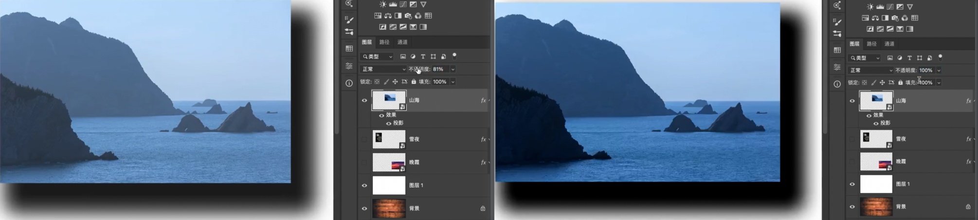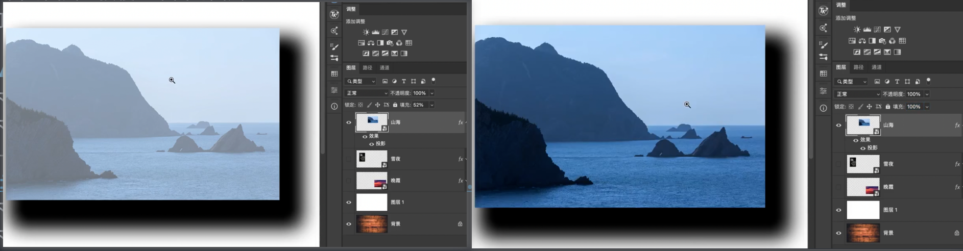 - 如果直接在前景图层上方添加调整图层,调整图层的效果会作用在前景和背景两个图层上