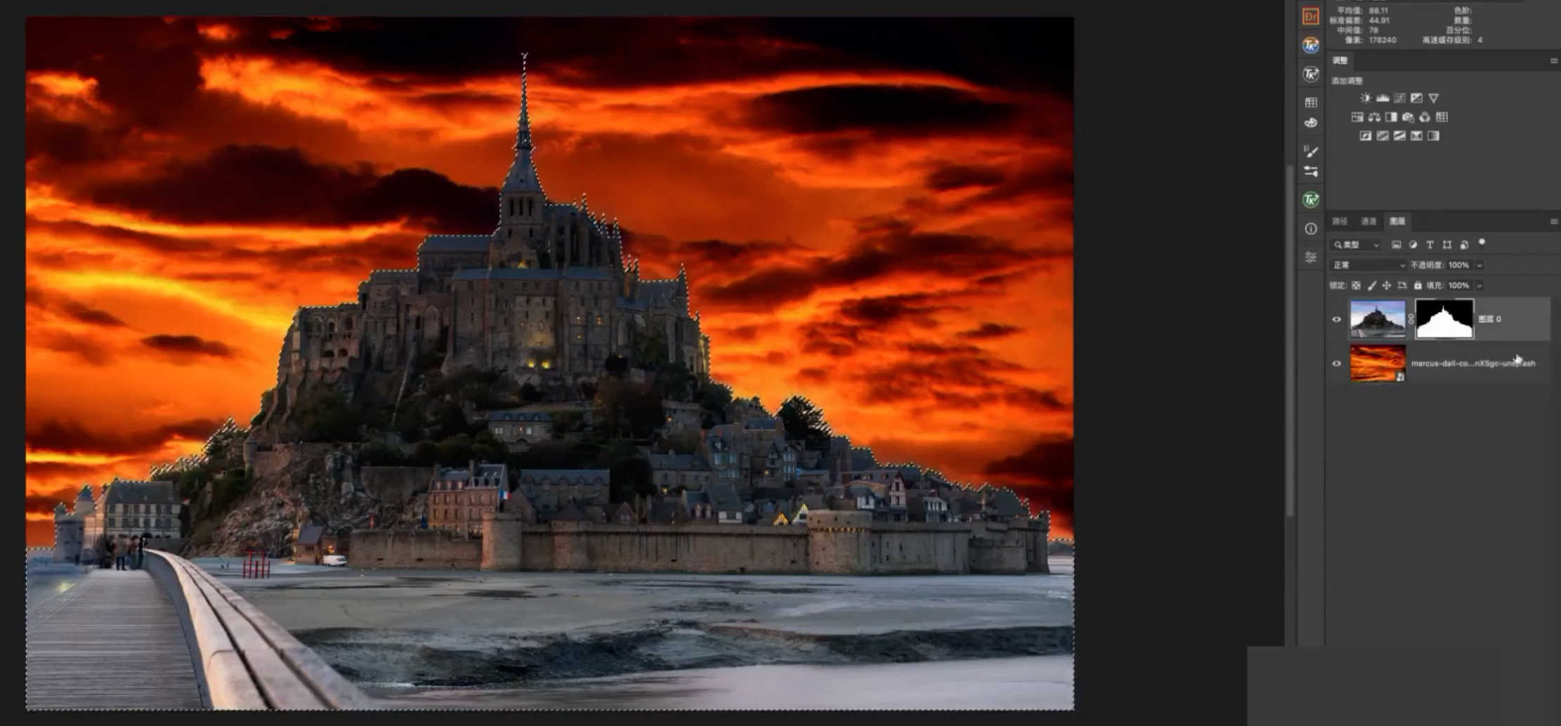 用选区选择蒙版的天空部分(先从蒙版建立选区,然后反选)